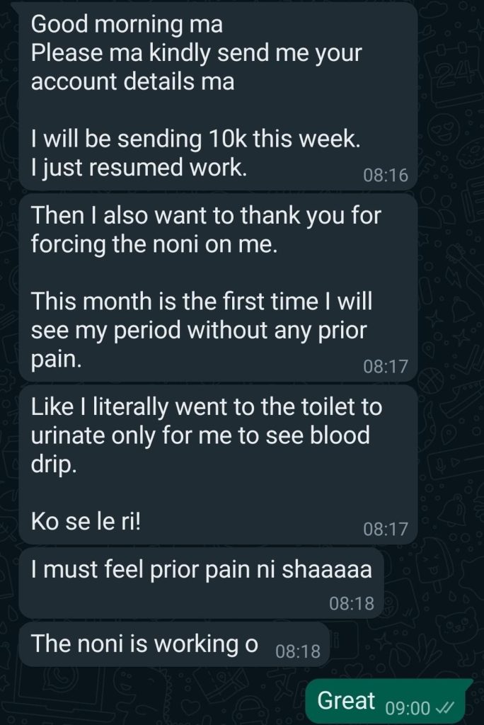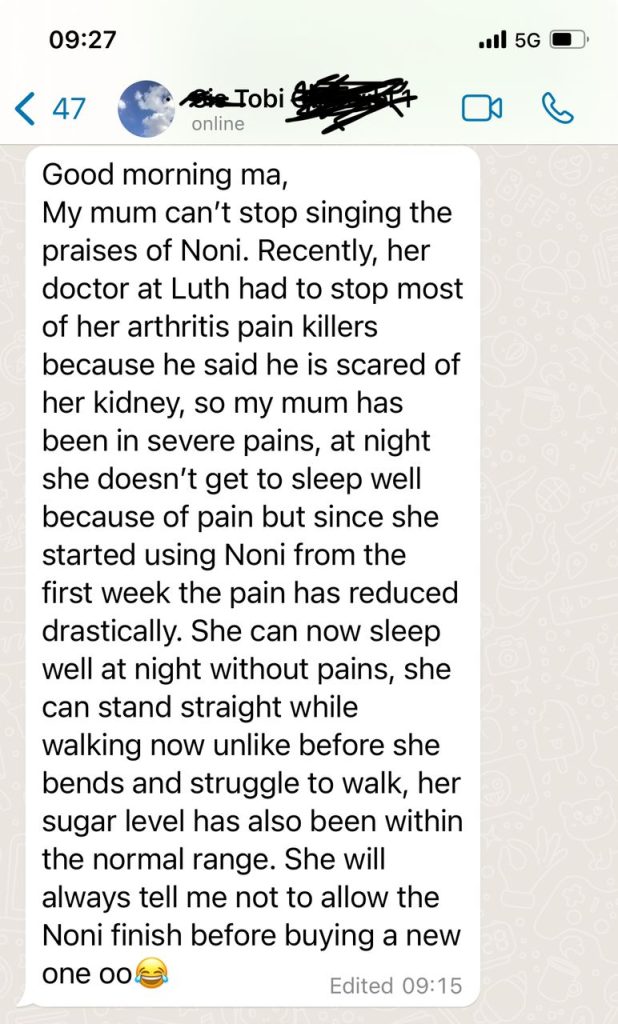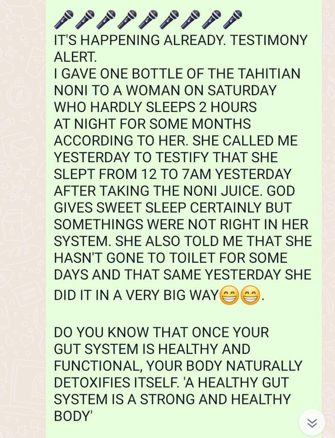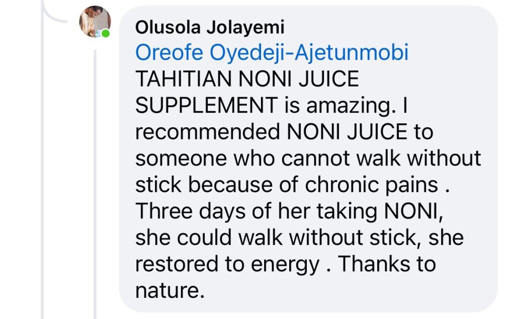 “For weeks, I experienced a bloated stomach and swollen legs. I thought it was normal until I visited Gad and was given 20ml of Tahitian Noni Juice. Within 10 minutes, I felt relief as I belched, and my stomach reduced reasonably. I was amazed by the quick results and grateful for the introduction to that miracle juice!”